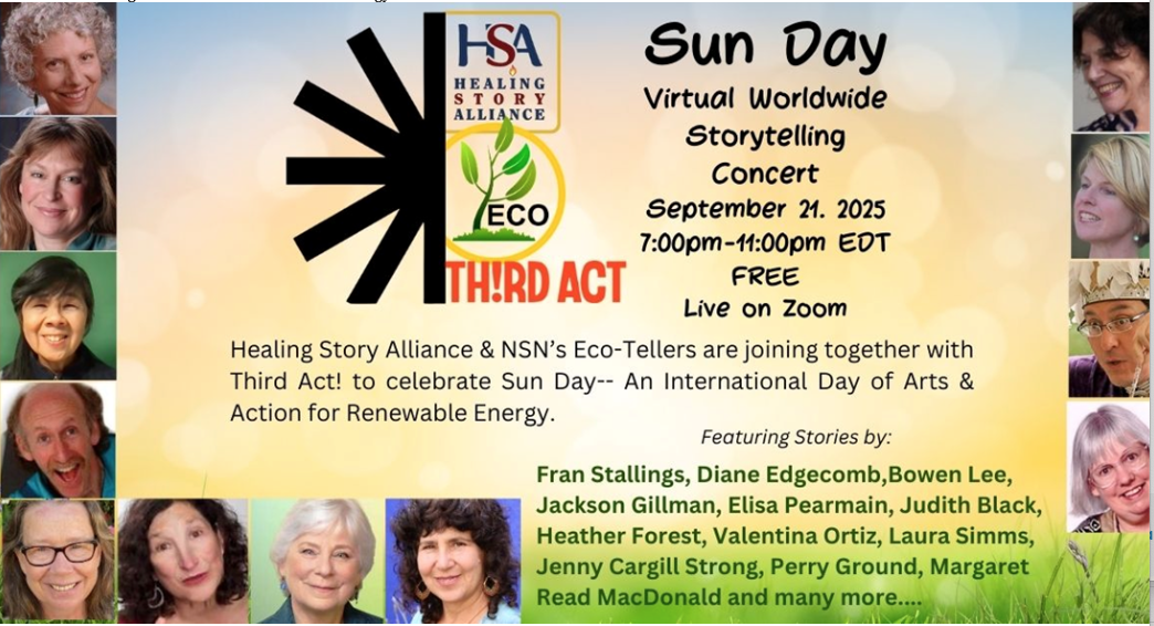 Sun Day a Virtual Worldwide Storytelling Concert  September 21. 2025 7:00pm-11:00pm Live on Zoom Free!  (Donations Welcome) To Register: https://www.simpletix.com/e/sun-day-virtual-worldwide-storytelling-con-tickets-226248 The NSN Eco-Tellers and Healing Story Alliance will be joining Third Act (Thirdact.org) and affiliated climate groups from all over … Continue reading